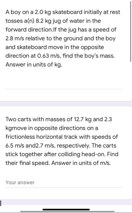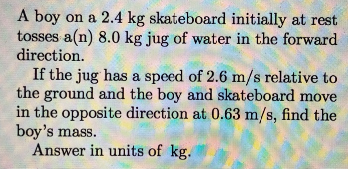 If the jug has aspeed of 30 ms relative to the ground and the boy and theskateboard moves in the opposite direction at 06 ms find theboys mass. The product of mass and velocity is. 0 -79 26 m 058 where m is the total mass of the boy skateboard.