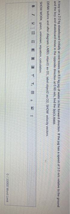 . Is the boys mass 55 kg. Total momentum 7500 kgms. A boy on a 2kg skateboard initially at rest tosses an 8kg jug of water towards the right.